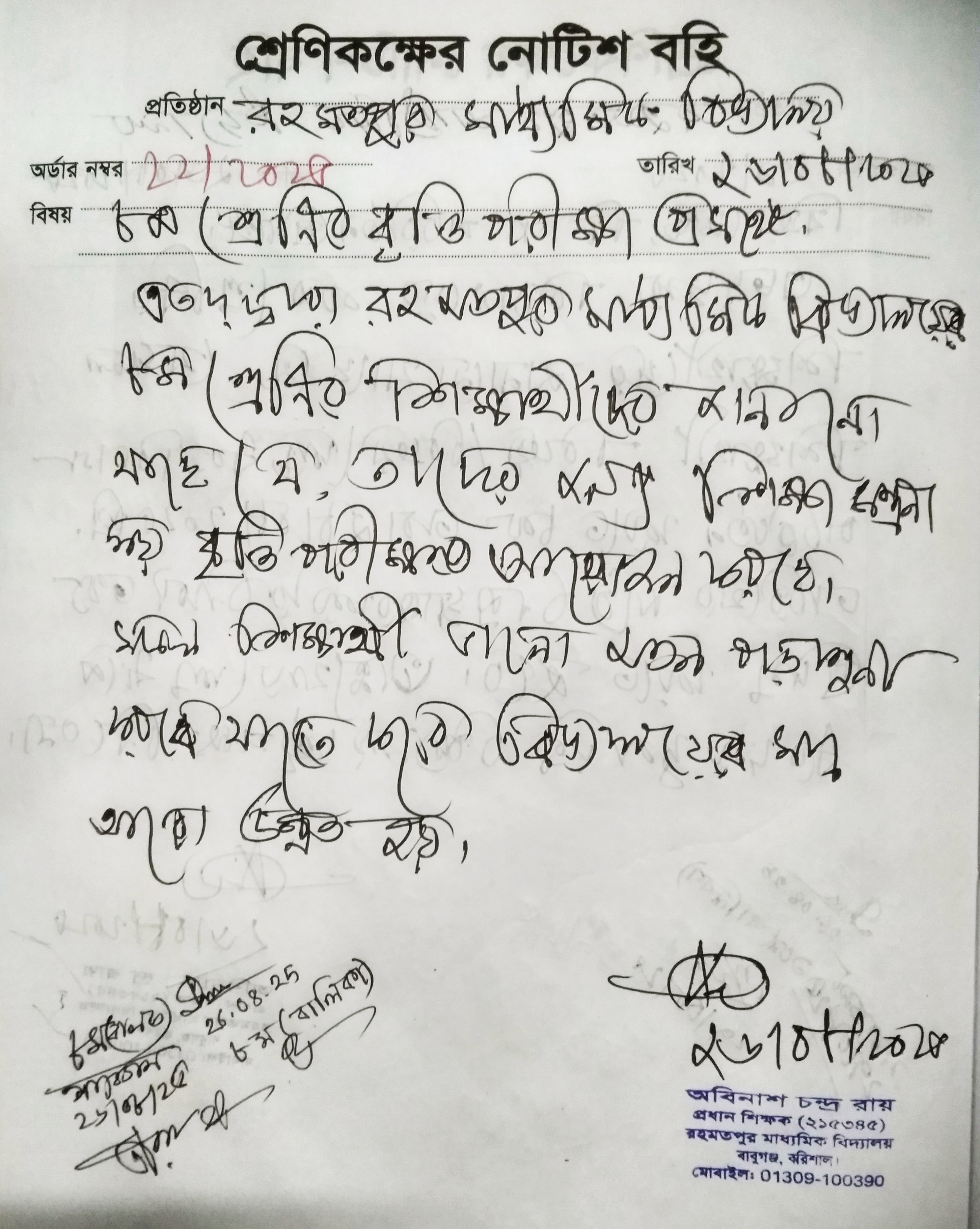 ৮ম শ্রেণীর বৃত্তি পরীক্ষার নোটিশ